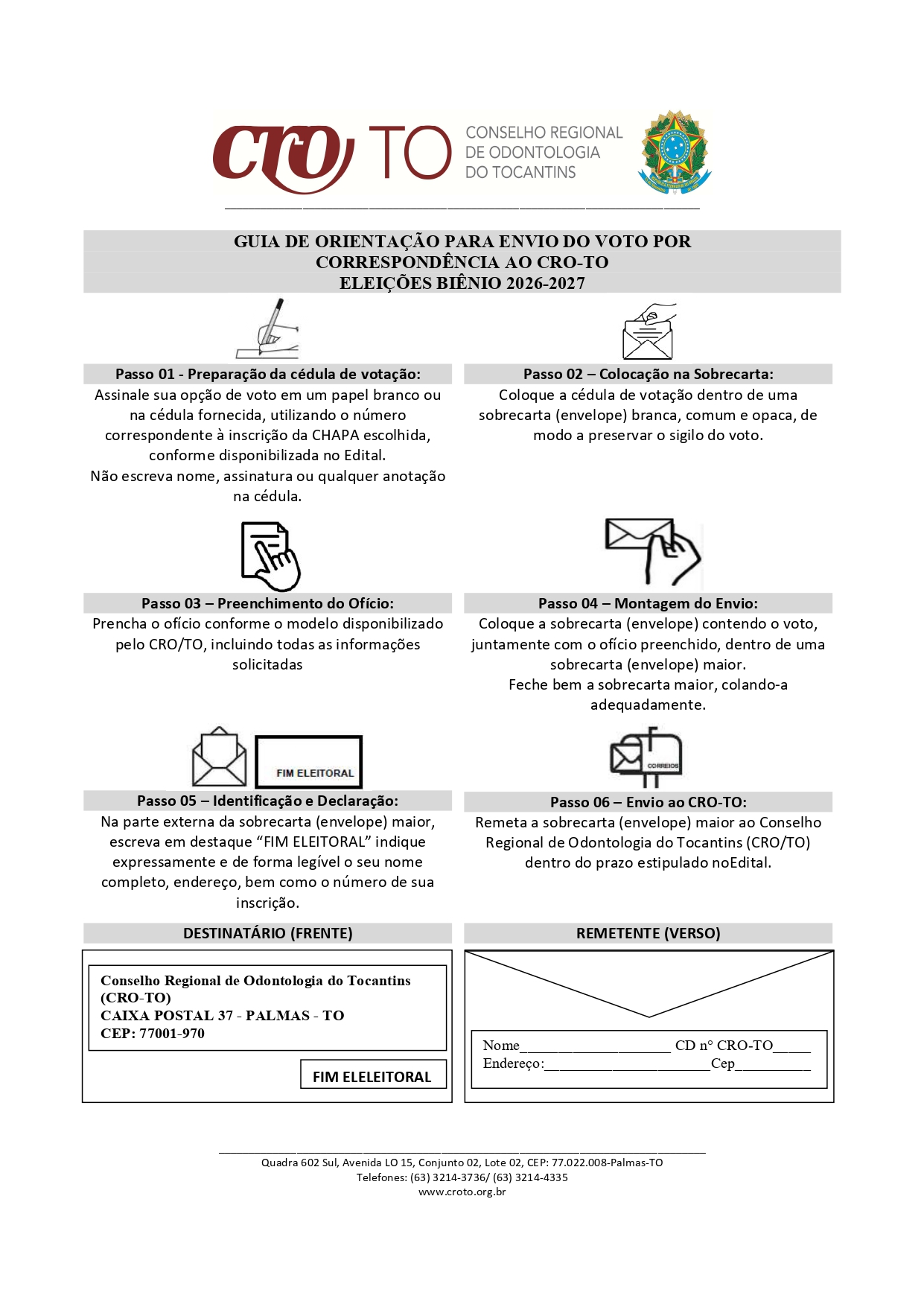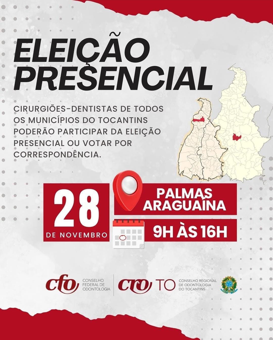 O Presidente da Comissão Eleitoral do Conselho Regional de Odontologia do Tocantins - CRO-TO, no uso de suas atribuições regimentais, considerando o disposto no artigo 37, Parágrafo segundo c/c artigo 46 do Regimento Eleitoral aprovado pela Resolução CFO-267, de 18 de dezembro de 2024 e DECISÃO CFO-47, de 27 de outubro de 2025 a qual fixa a data da eleição a ser realizada nos Conselhos Regionais de Odontologia, CONVOCA para a eleição do CRO/TO, para a renovação da composição do Conselho Regional de Odontologia do Tocantins, para os dias 28.11.2025 (1º turno) e 18.12.25 (2º turno, se houver), na MODALIDADE PRESENCIAL, no horário das 09h às 16h, na sede do CRO/TO, localizada na Quadra 602 Sul, Avenida LO 15, Conjunto 02, Lote 02, CEP: 77.022.008 - Palmas-TO e na Delegacia Regional do CRO-TO, localizada na Avenida José de Brito, nº 433, Sala 06, Setor Jorge Yunes, CEP 77.818-530 – Araguaína - TO.